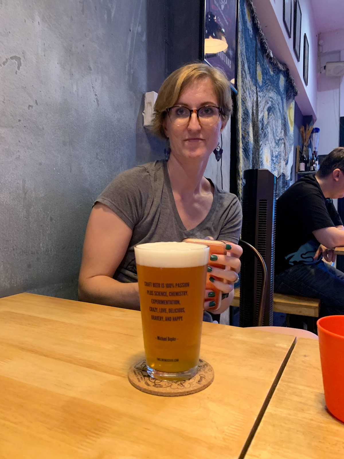 First, loved the place. The ambiance. The feel. The grittiness of it. Just simple tables and chairs. Little kitchen in the back. Some spare kegs and the like tucked into corners. It’s not that it was run down or dirty, but gritty. Real. Like going to Cousin Joe’s house because he’s got a basement bar and grills up a mean burger type feel to it. They also had a Stone Brewing Sign and served me in a Ballast Point glass, as I was wearing a Ballast Shirt.