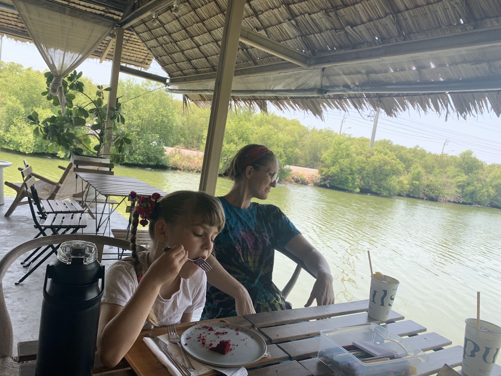 We did get to a cafe near us the other day. Kiddo wanted to write in her book and J and I wanted coffee. The place is right on water and then add in shade, some fans, and a breeze to top that off and it was a comfortable little outing. Besides, can anything beat a piece of Red Velvet cake before some writing?